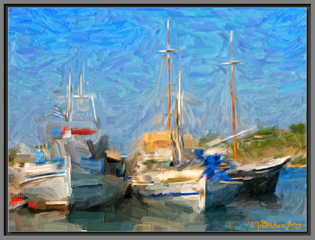 JOHANN A.G. BALOGHY – 9. Fishing Boats in Pyrgadikia/Chalkidiki – 2007 – Greece – digital painting printed on EPI UV radiation-protected canvas